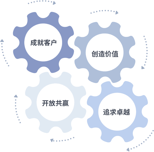 成就客户是一切决策的出发点,,,创造价值是衡量所有工作的标准,,,追求卓越是我们做事做人的态度,,,开放共赢是我们的格局也是最终的结果。。。。价值观的齿轮环环相扣,,,,推动着组织里的每个人不断向前。。。